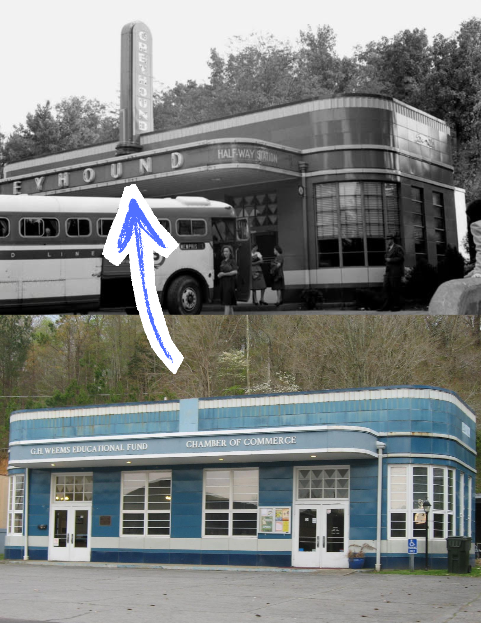 The Greyhound Half-Way House at 124 E. Main Street in Waverly opened as a Greyhound “half-way” station in the late 1930s, serving as the midpoint rest stop on U.S. Highway 70 between Nashville and Jackson. The current Streamline Moderne building, faced in distinctive blue glazed tile and designed by architect William Nowland Van Powell, was constructed in 1938–39, replacing an earlier bus stop on the same site that had operated since 1925. The station closed to bus service in 1973 and later housed the local chamber of commerce. In recognition of its architectural and transportation history, it was listed on the National Register of Historic Places in 1999.